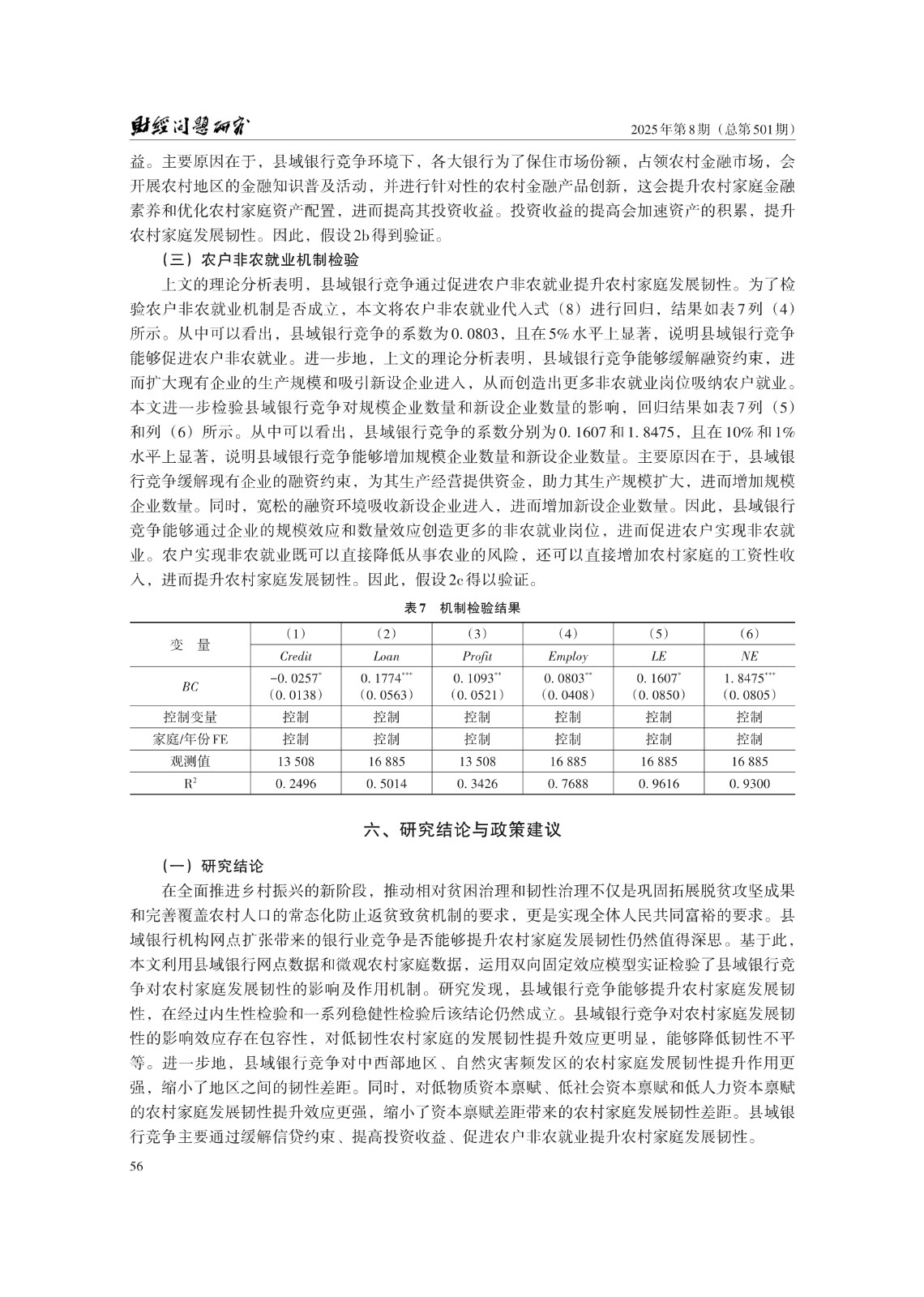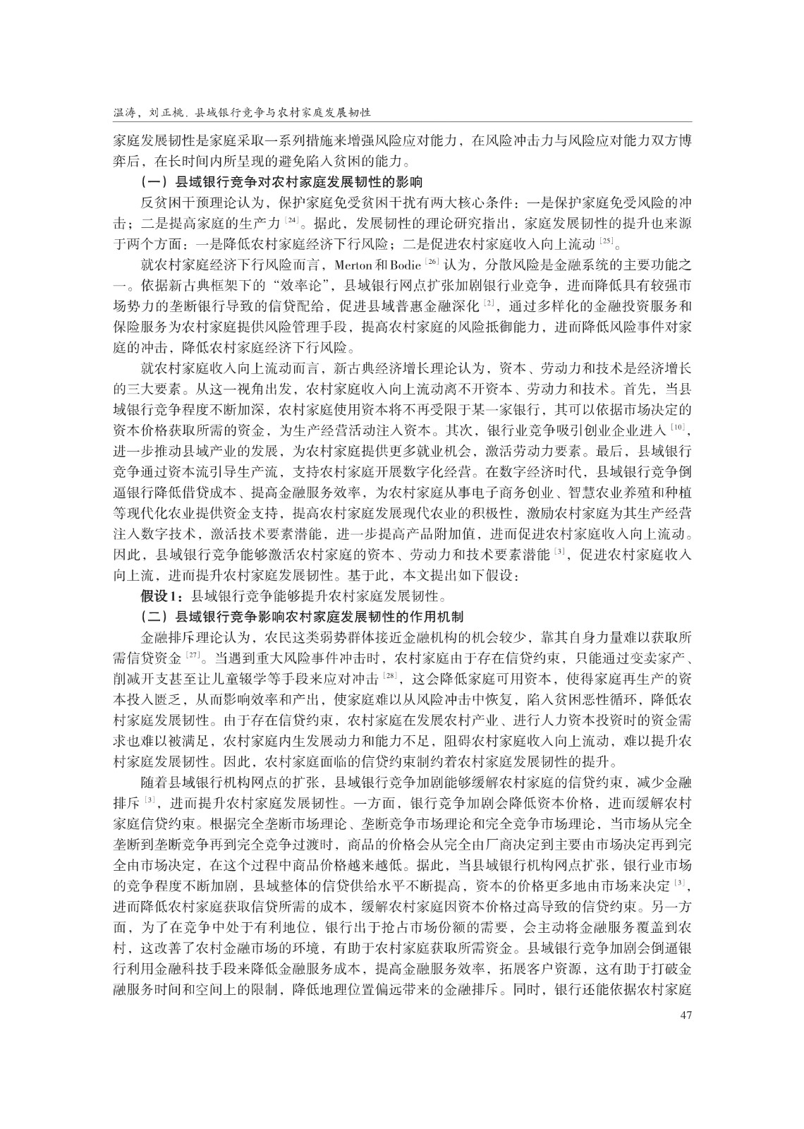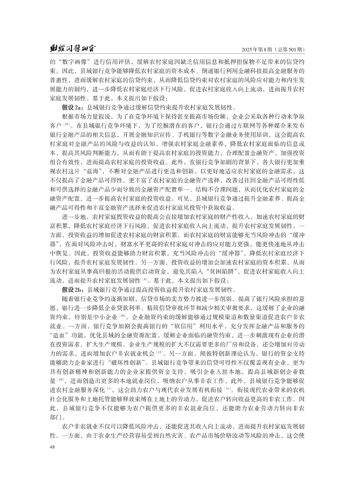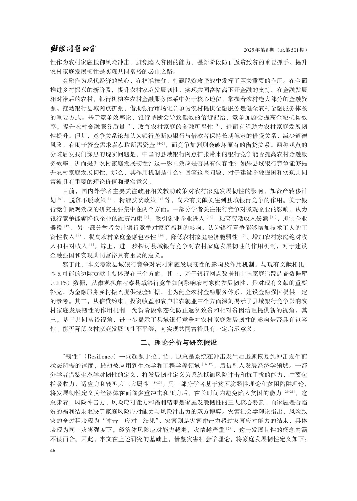 关键词: 县域银行竞争;农村家庭发展韧性;信贷约束;农户非农就业;共同富裕