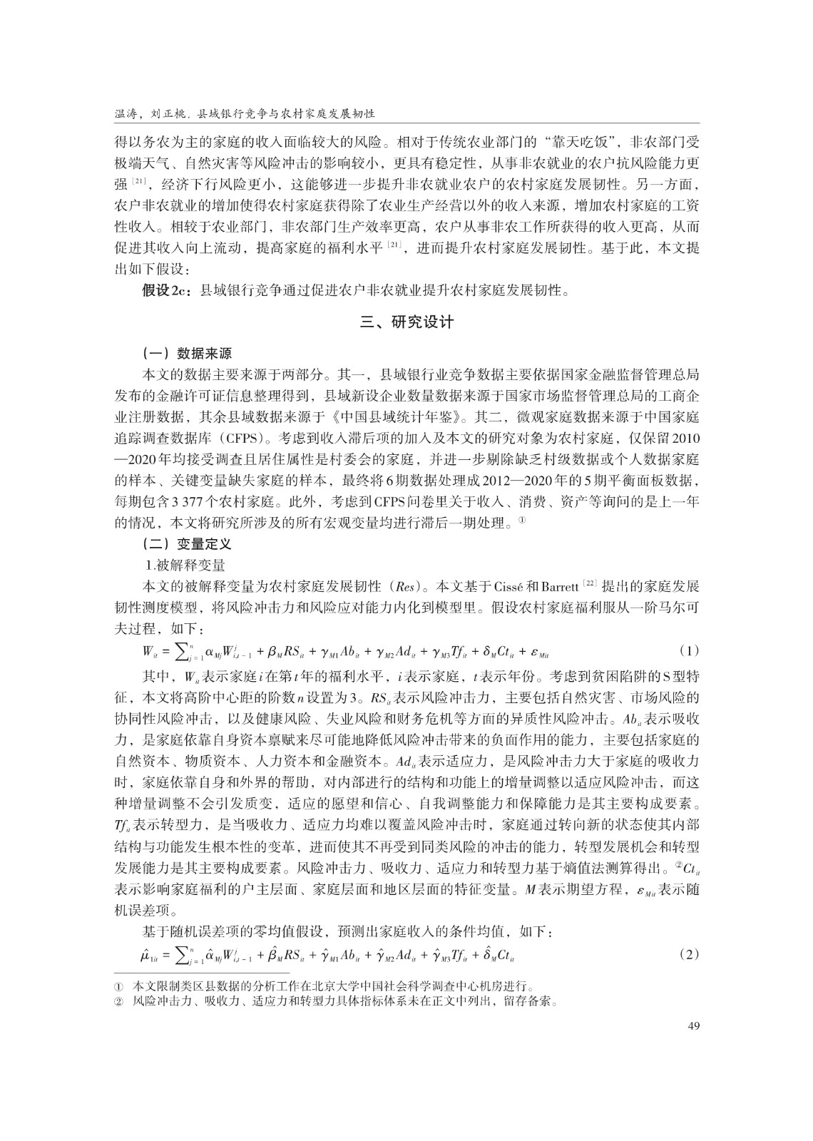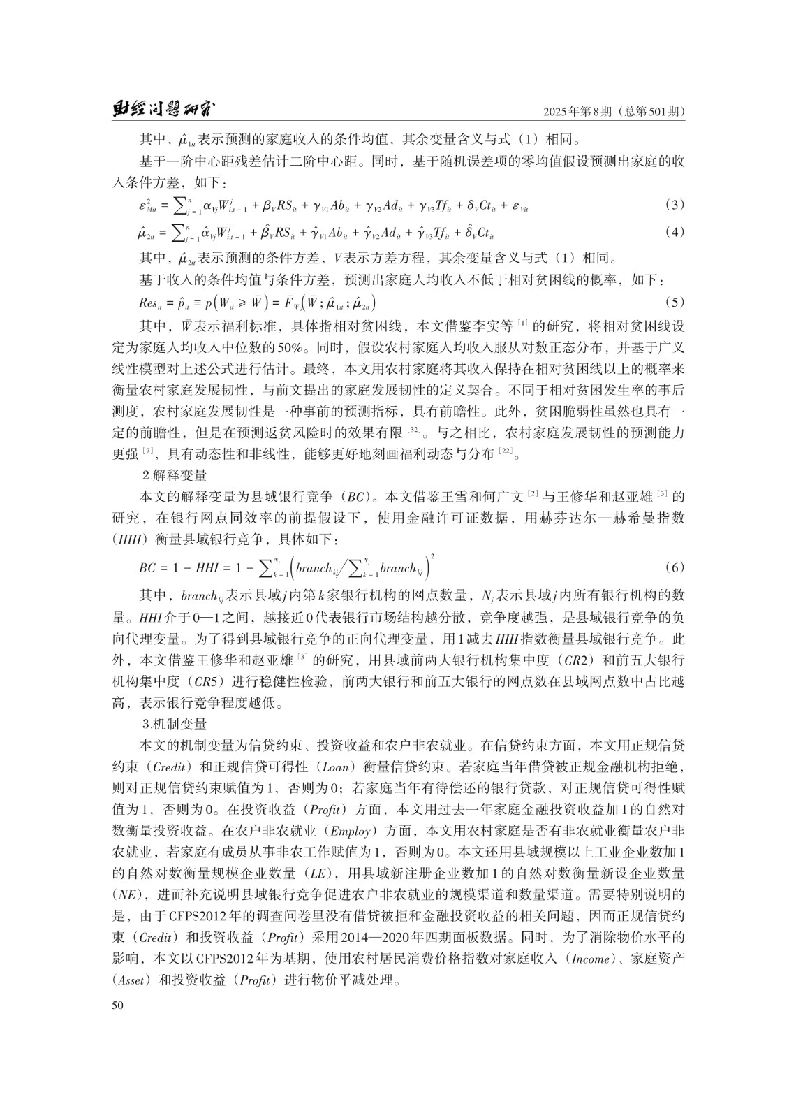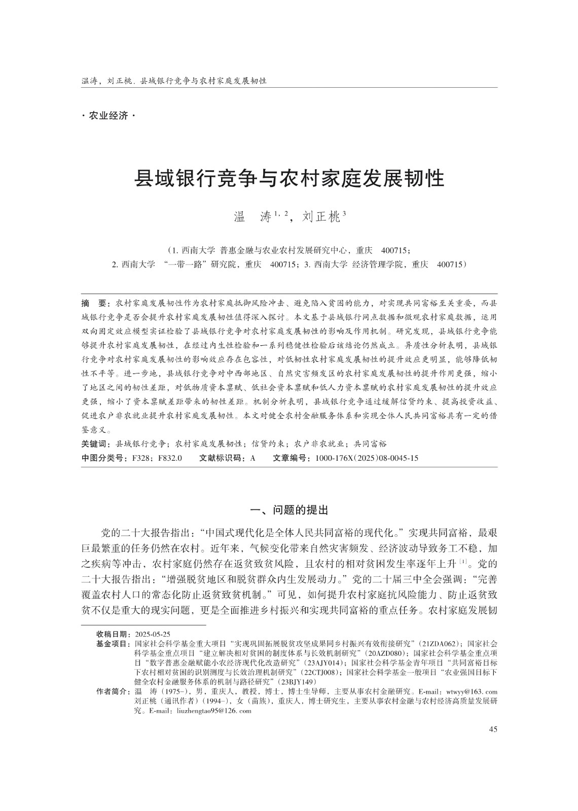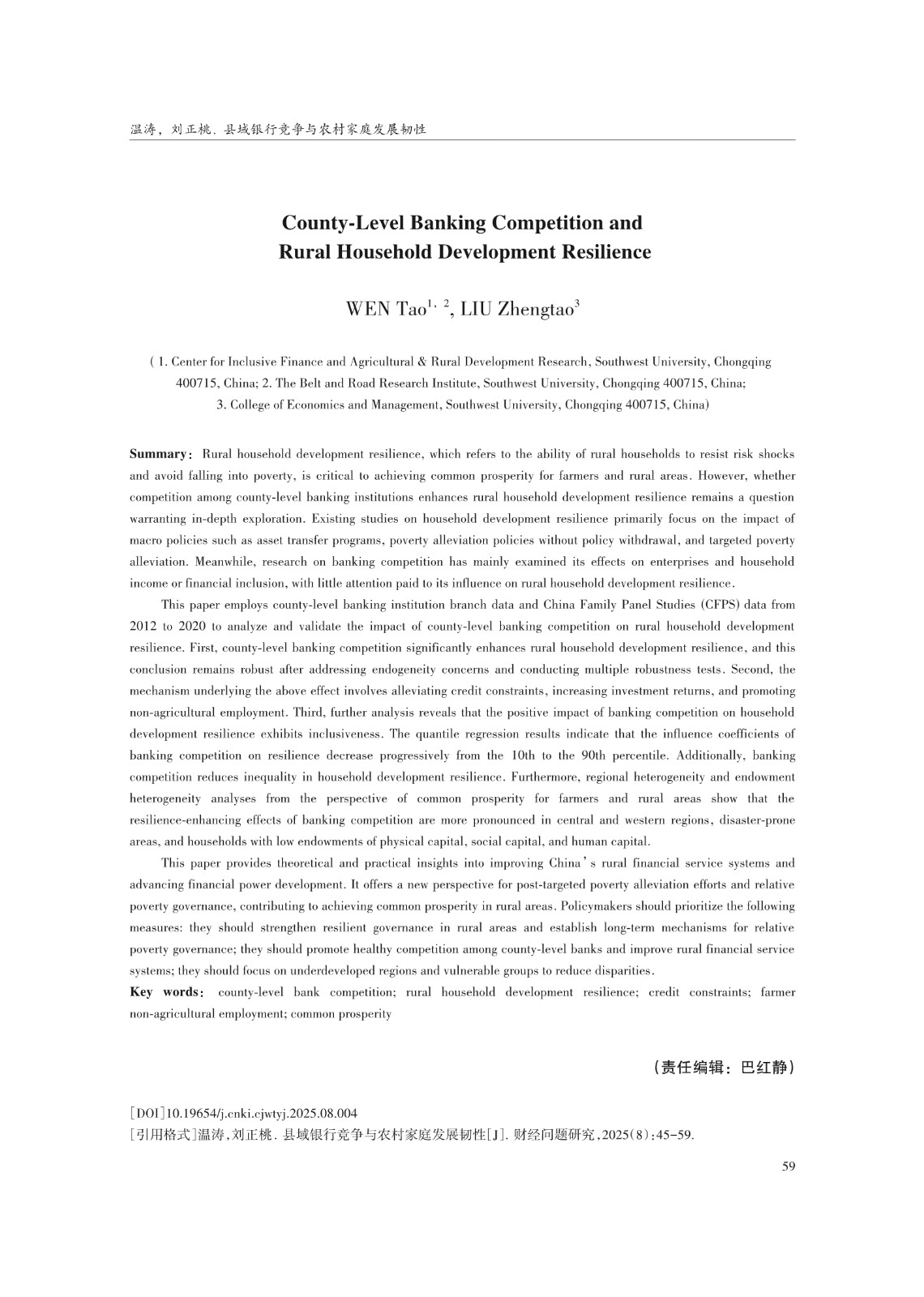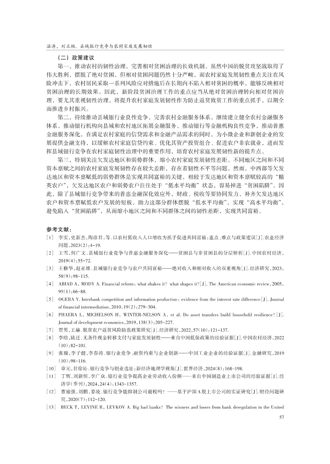 关键词: 县域银行竞争;农村家庭发展韧性;信贷约束;农户非农就业;共同富裕