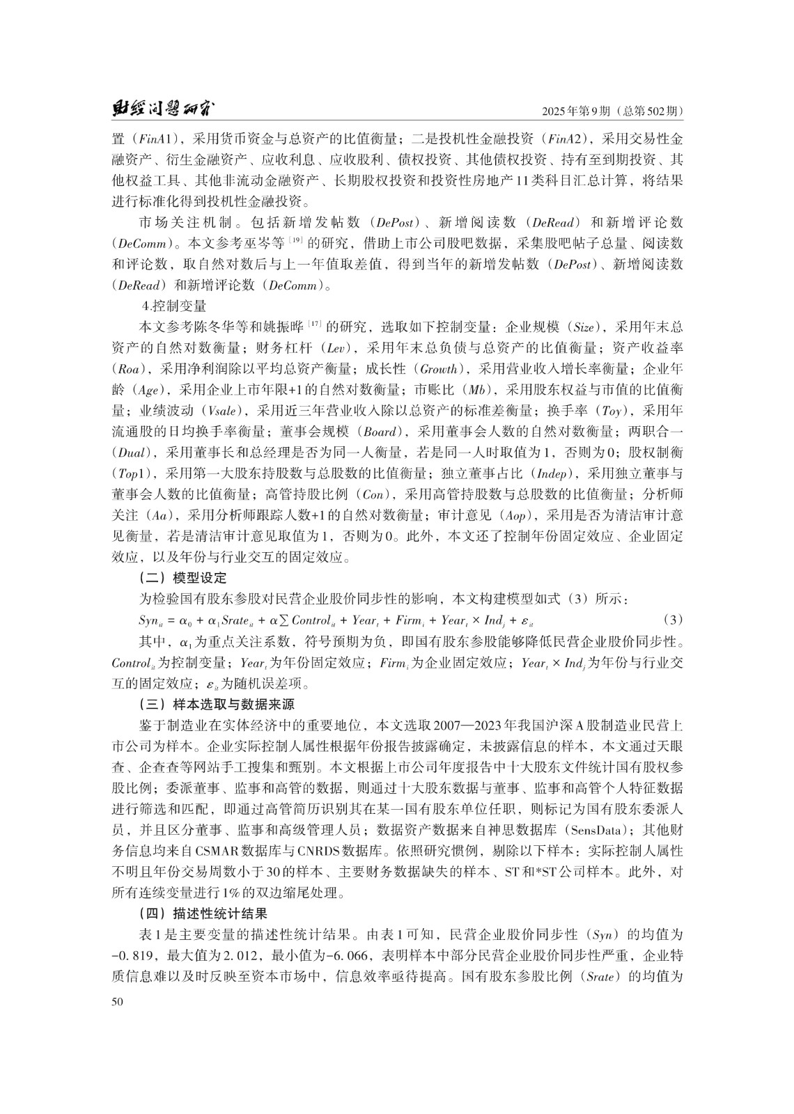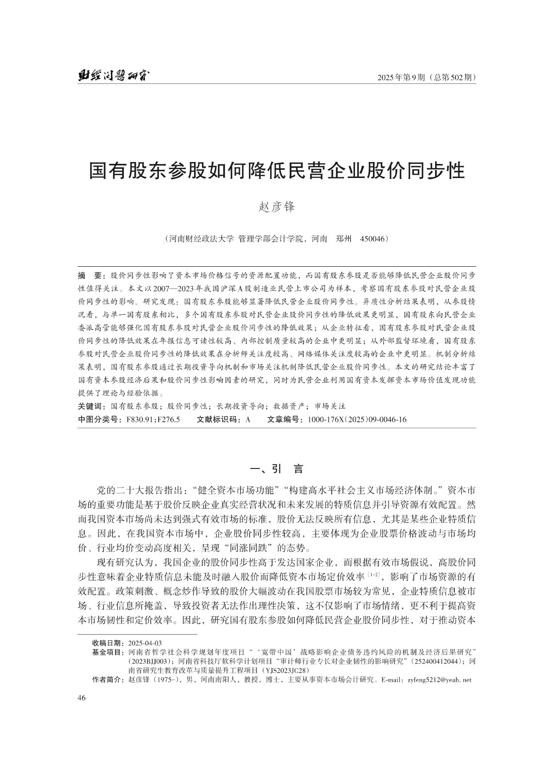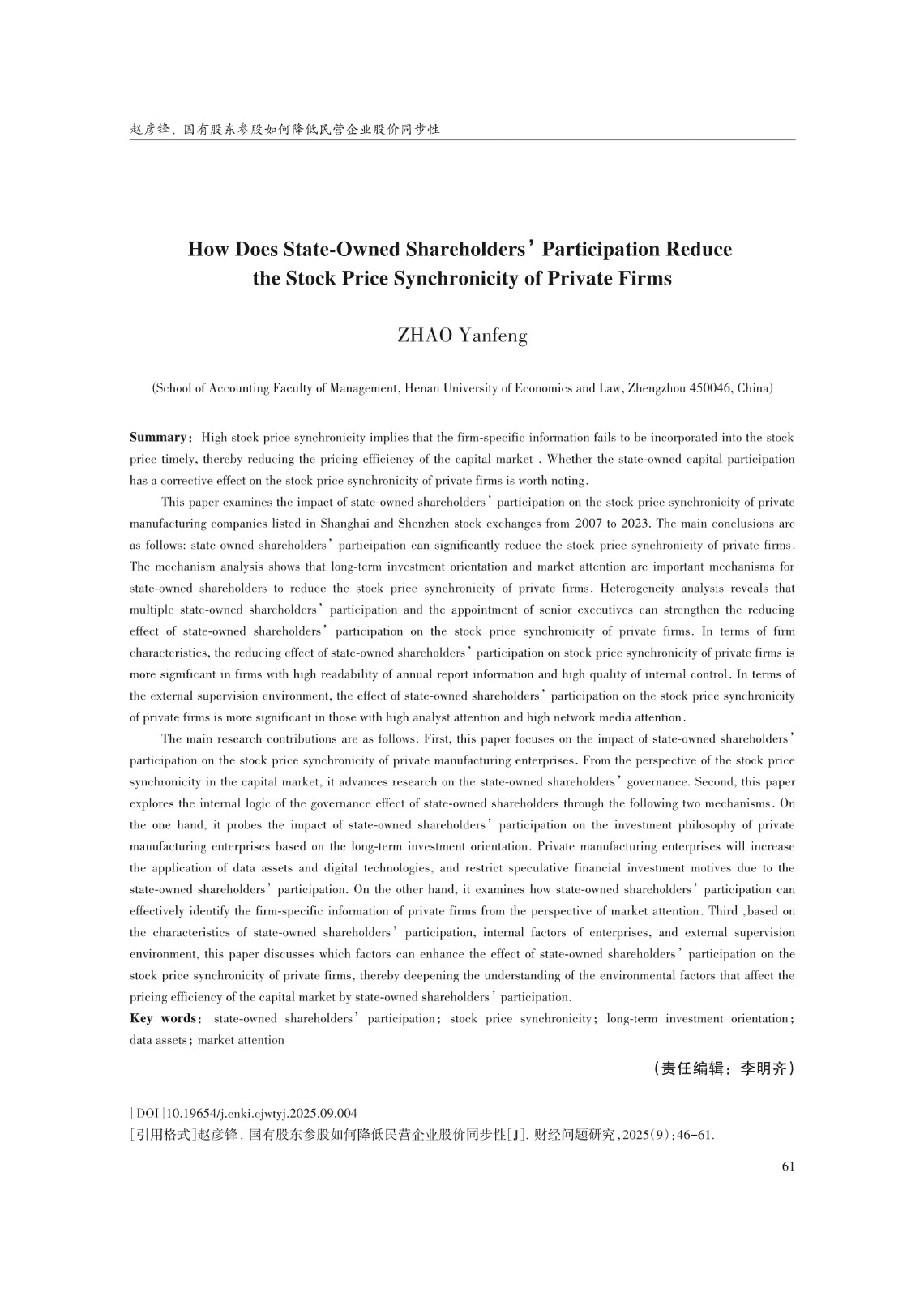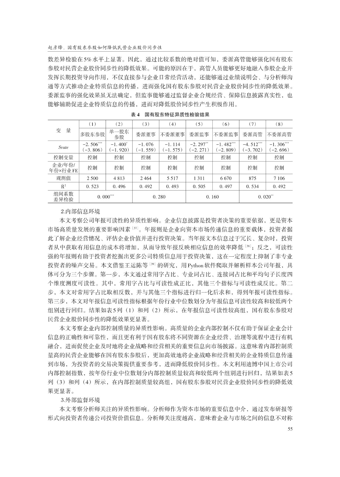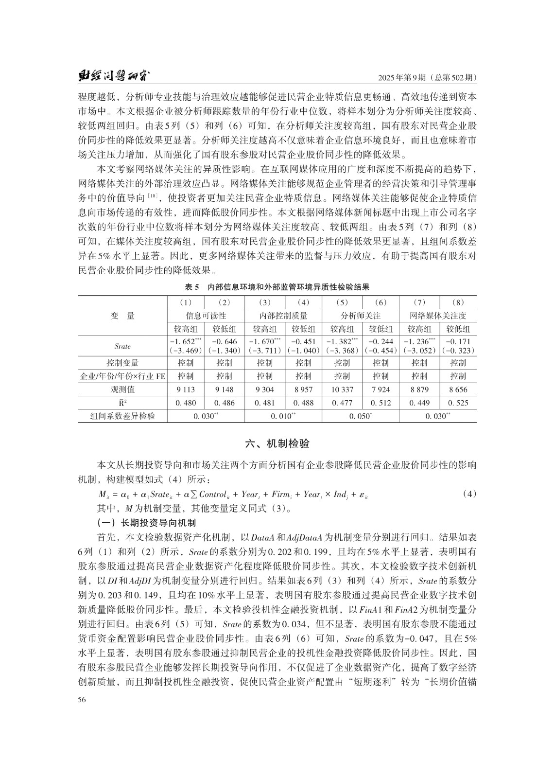 关键词: 国有股东参股;股价同步性;长期投资导向;数据资产;市场关注