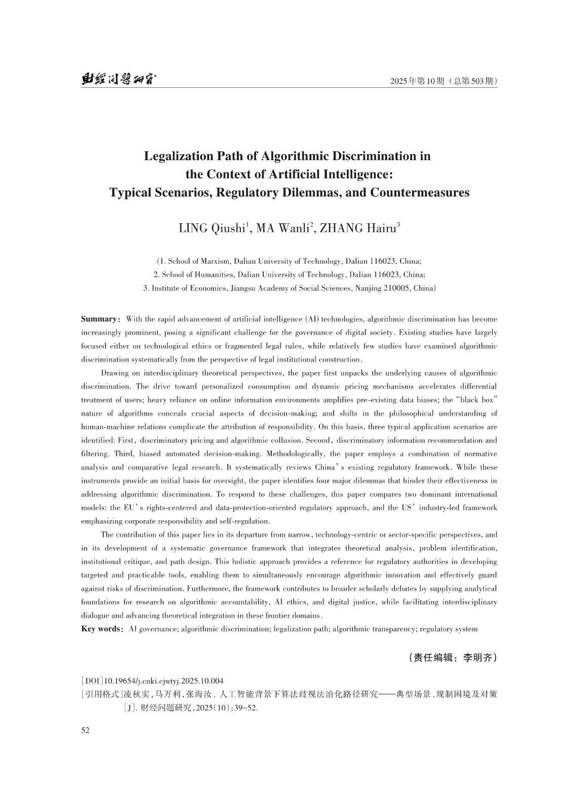 人工智能治理;算法歧视;法治化路径;算法透明度;规制体系