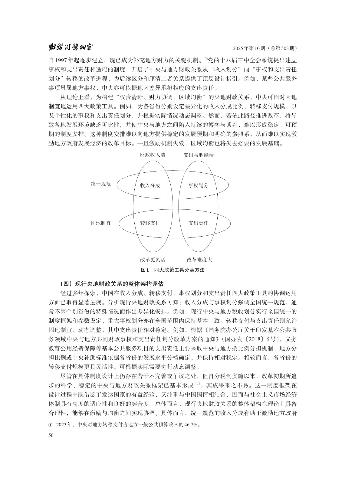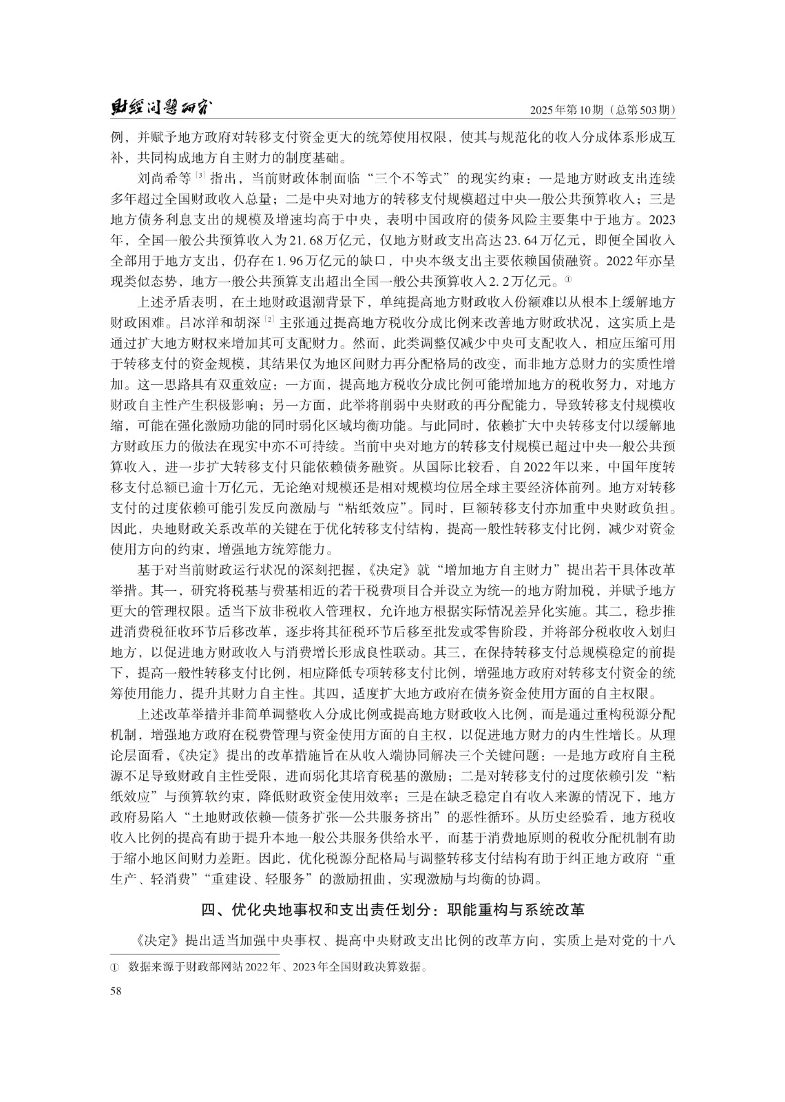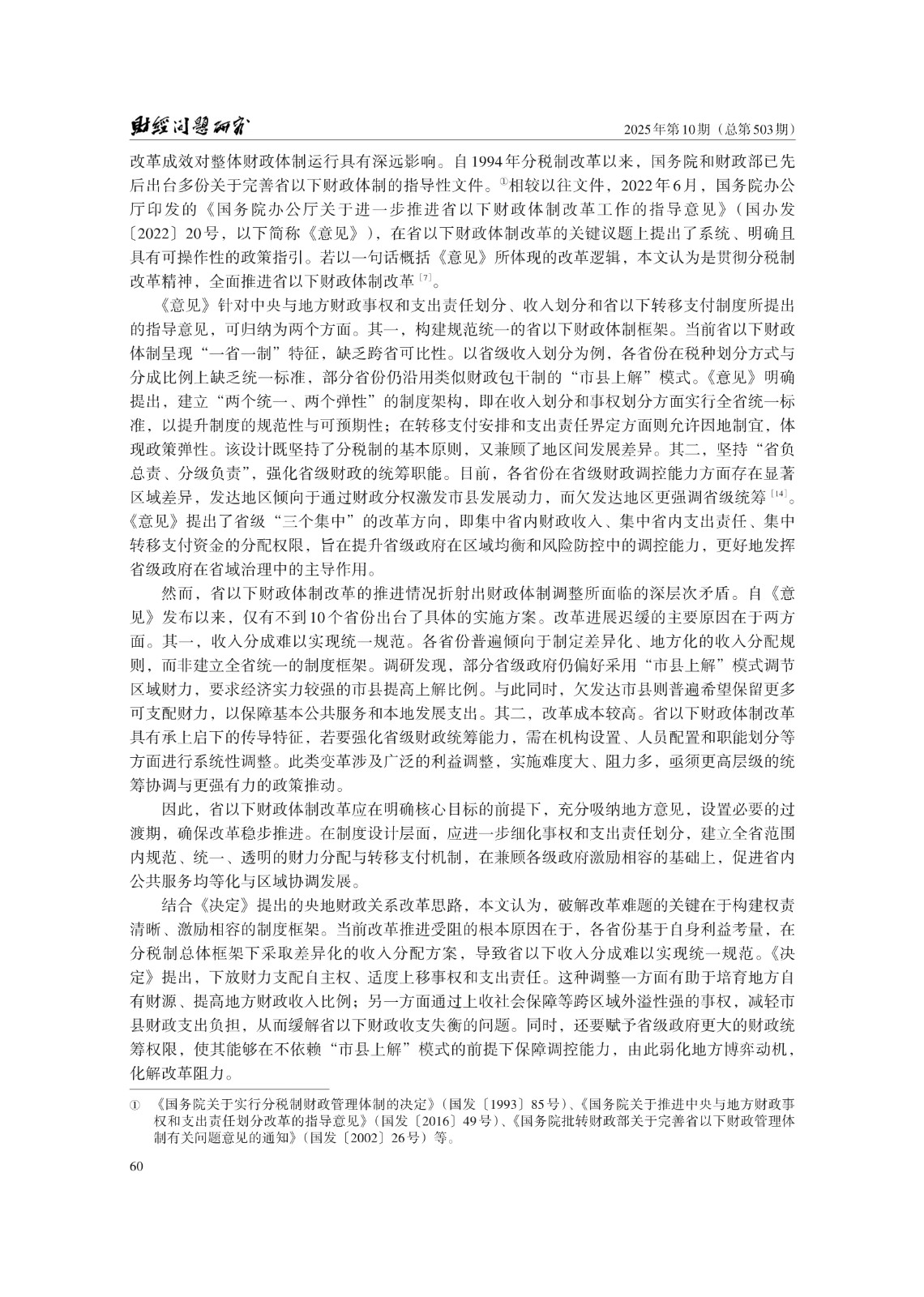 关键词: 央地财政关系;地方自主财力;事权和支出责任;省以下财政体制;全国统一大市场