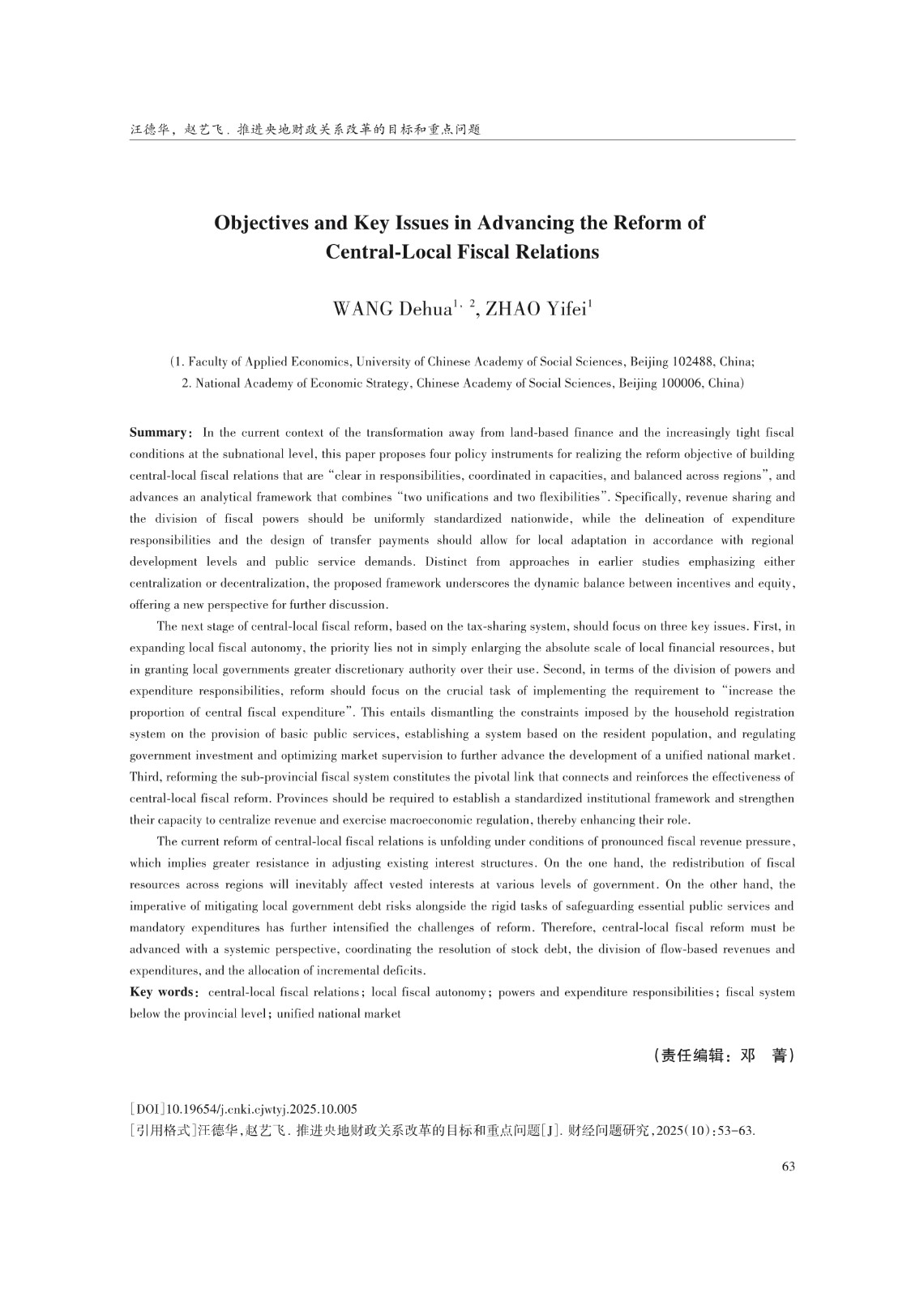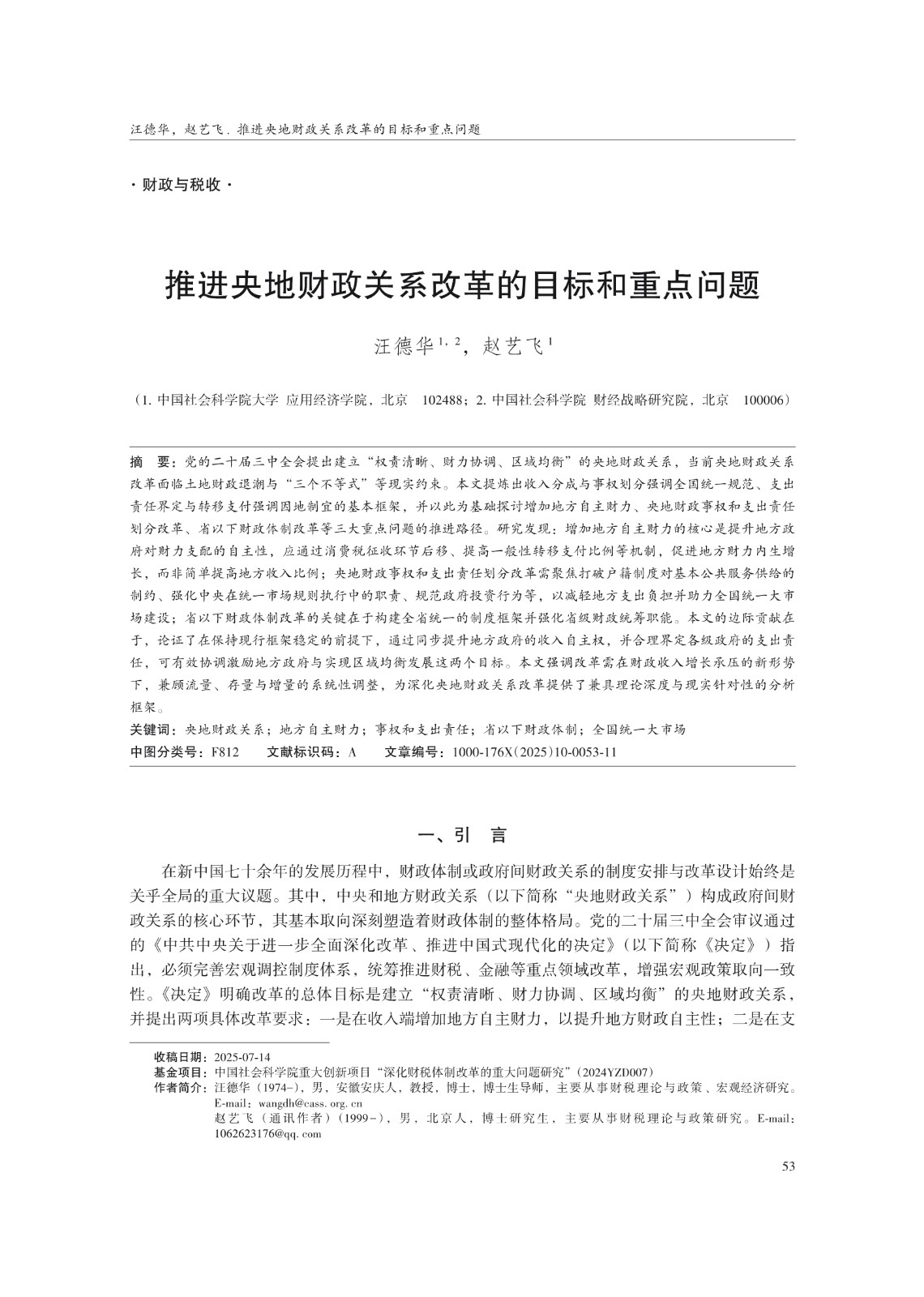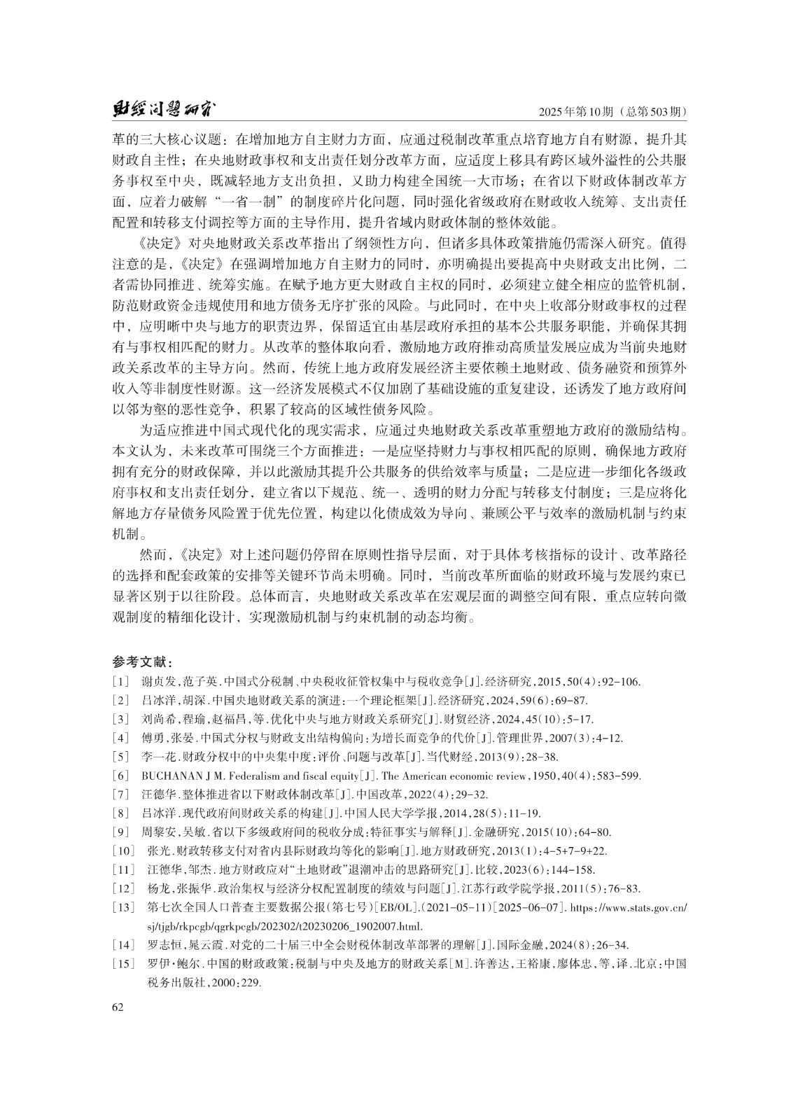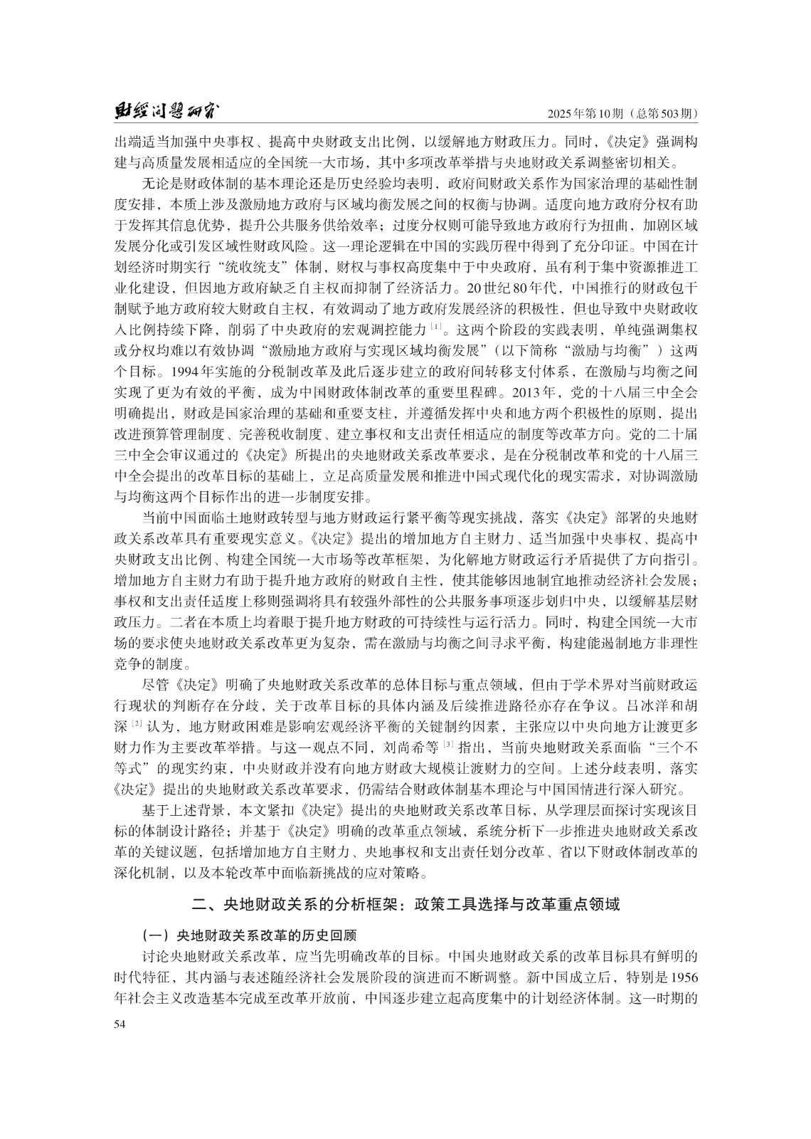 关键词: 央地财政关系;地方自主财力;事权和支出责任;省以下财政体制;全国统一大市场