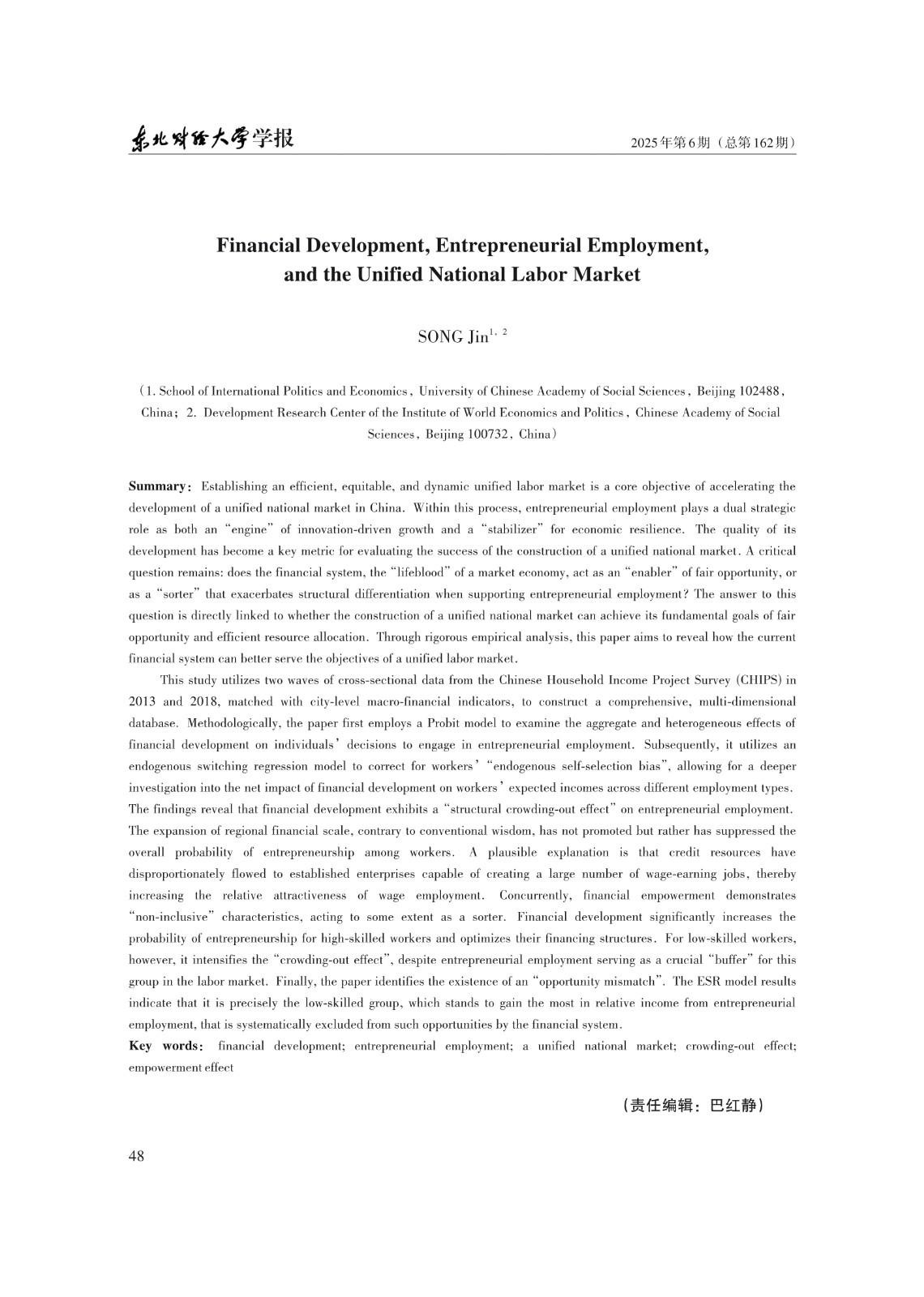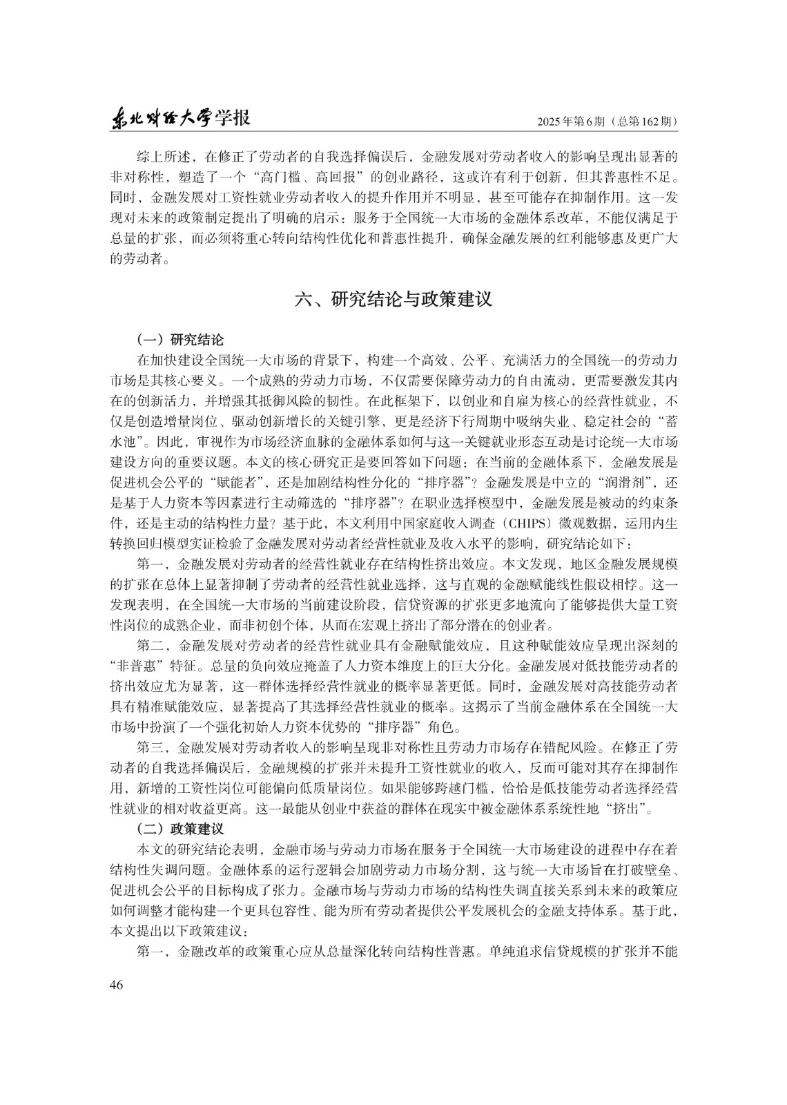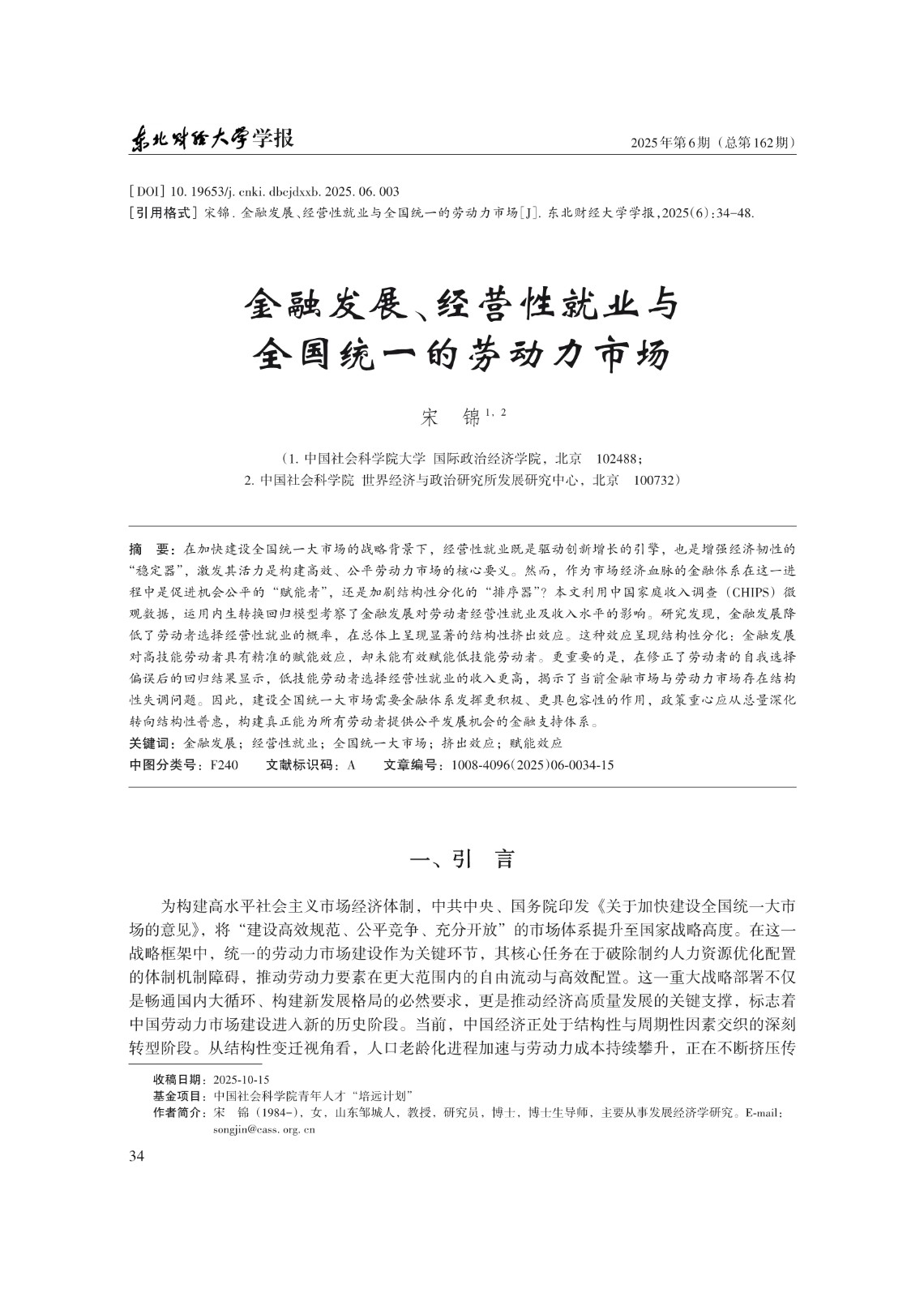 关键词: 金融发展;经营性就业;全国统一大市场;挤出效应;赋能效应