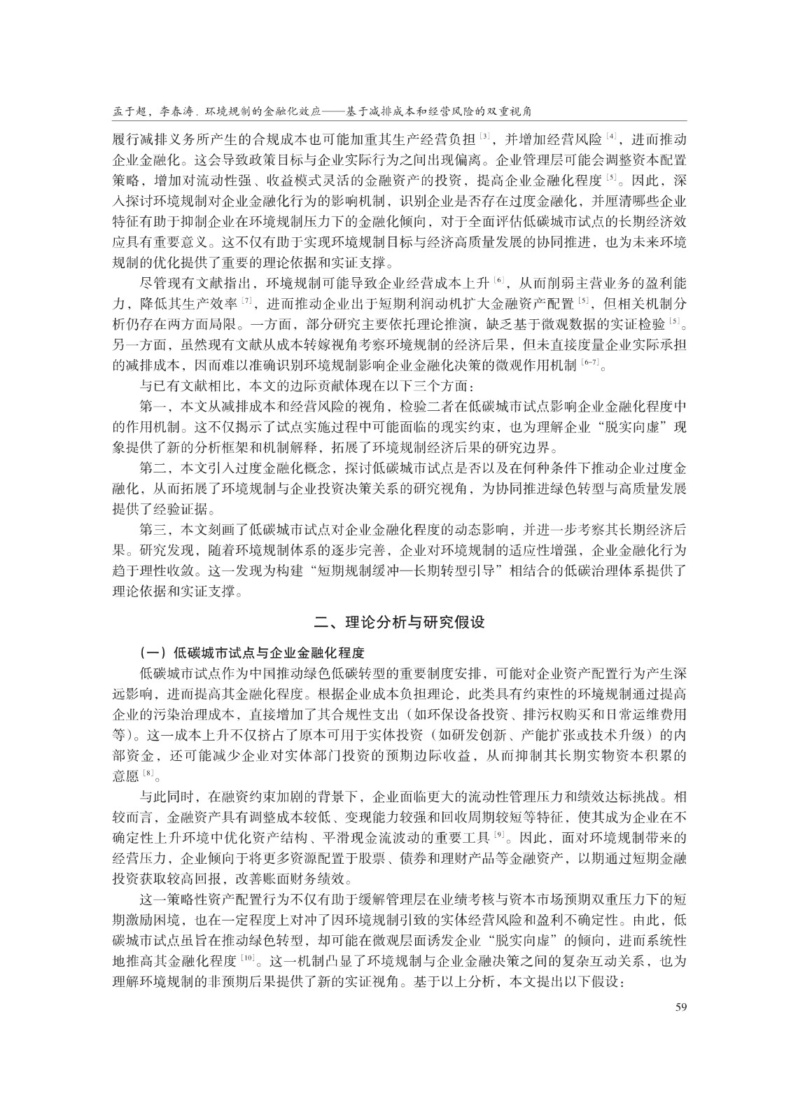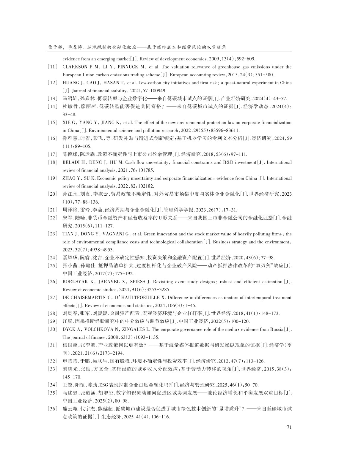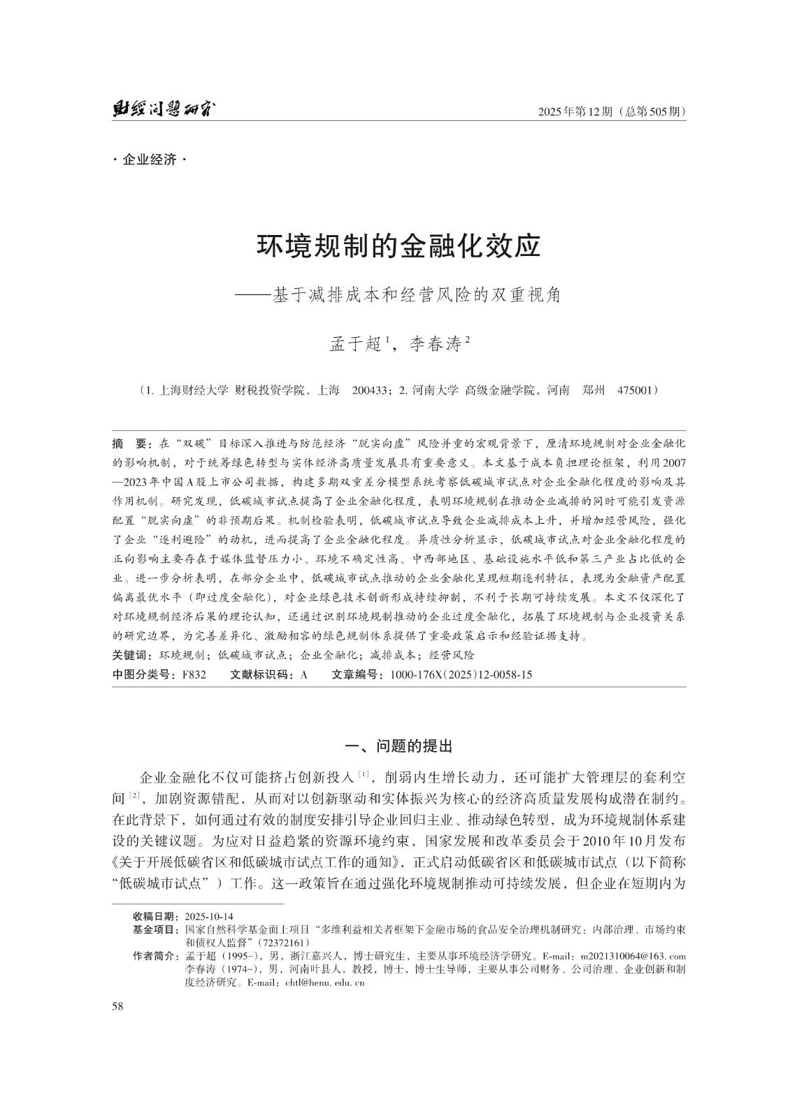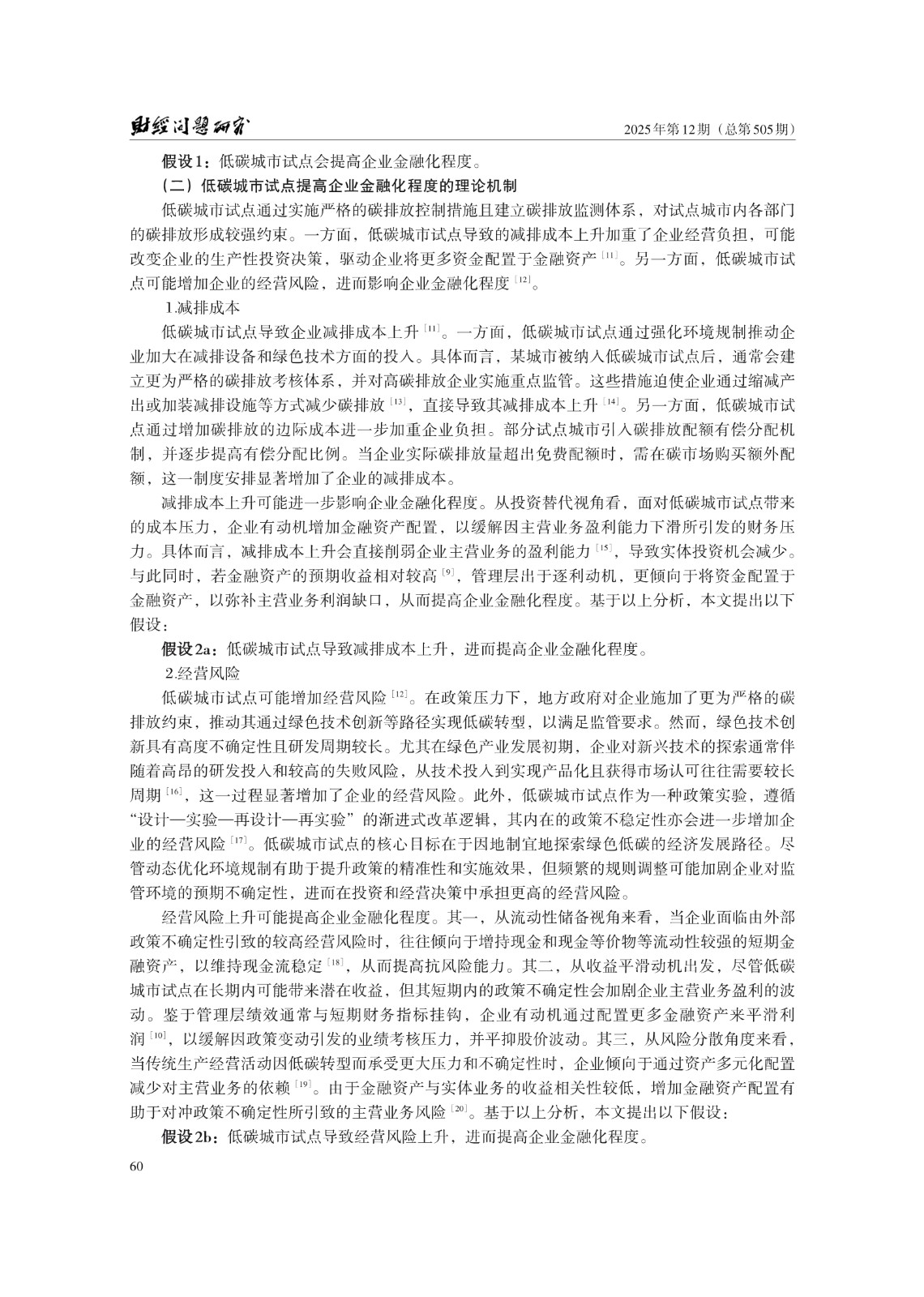 关键词: 环境规制;低碳城市试点;企业金融化;减排成本;经营风险