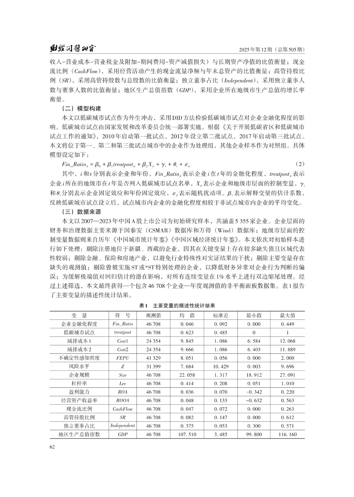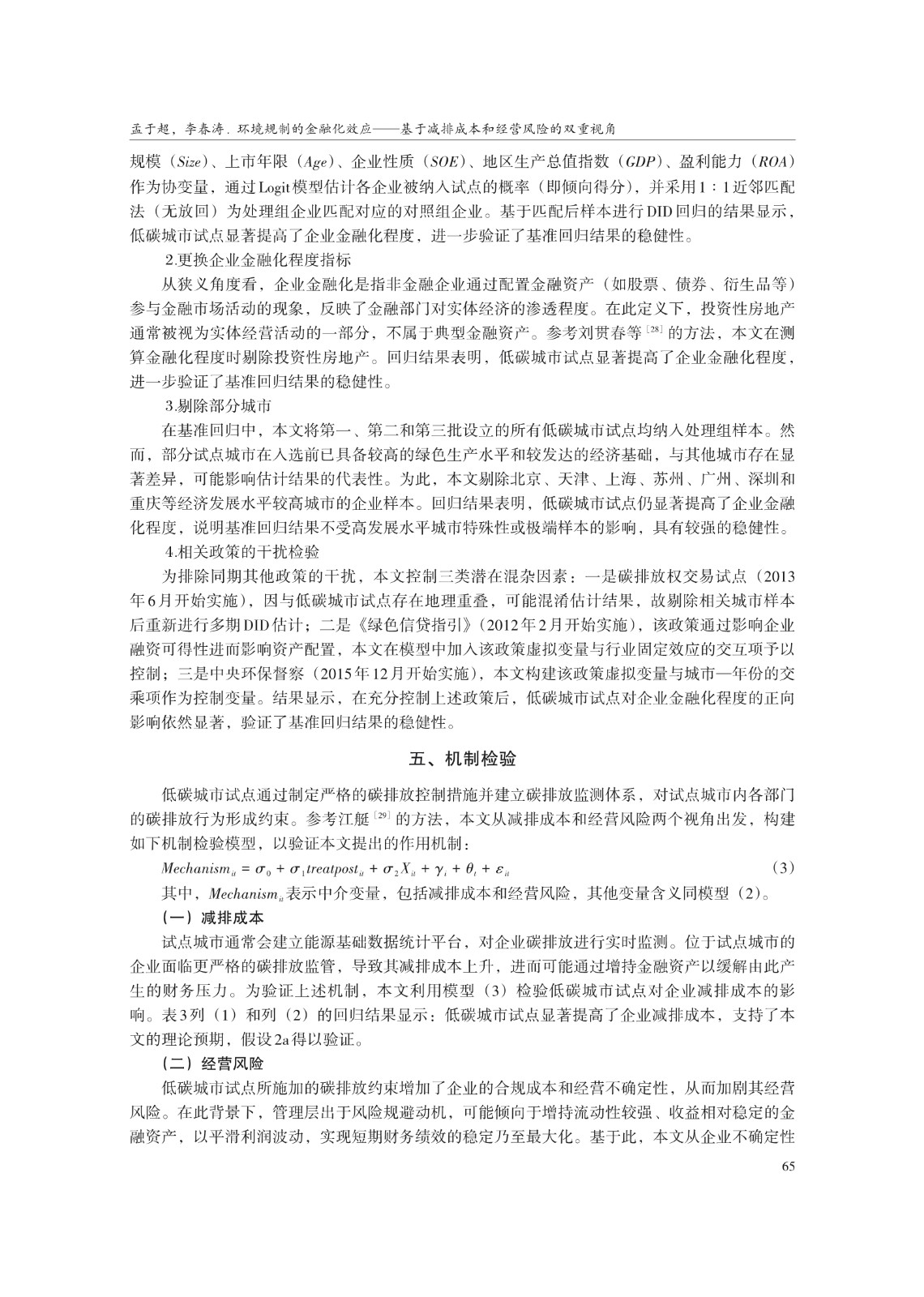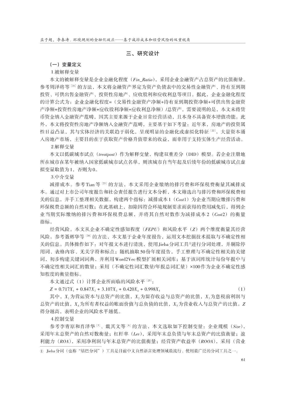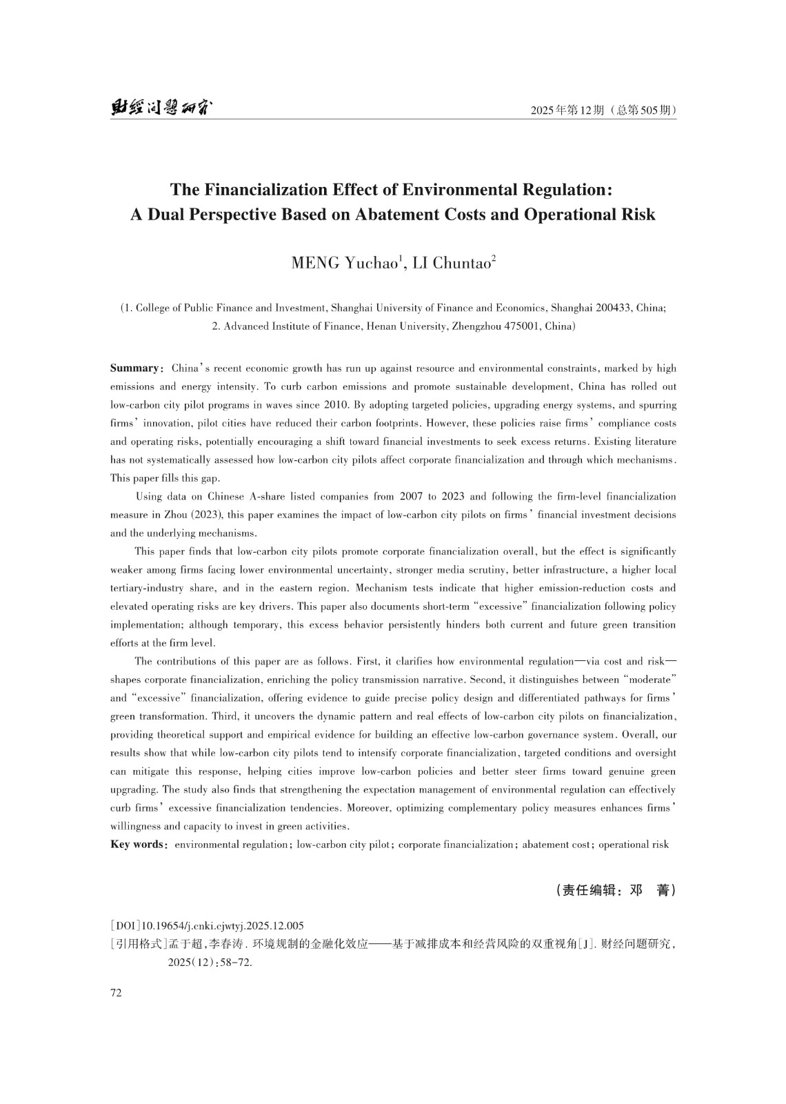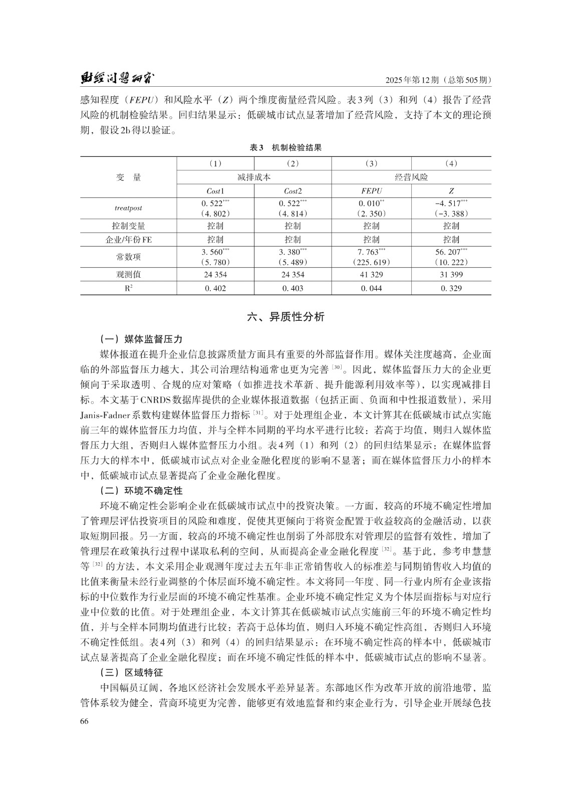 关键词: 环境规制;低碳城市试点;企业金融化;减排成本;经营风险