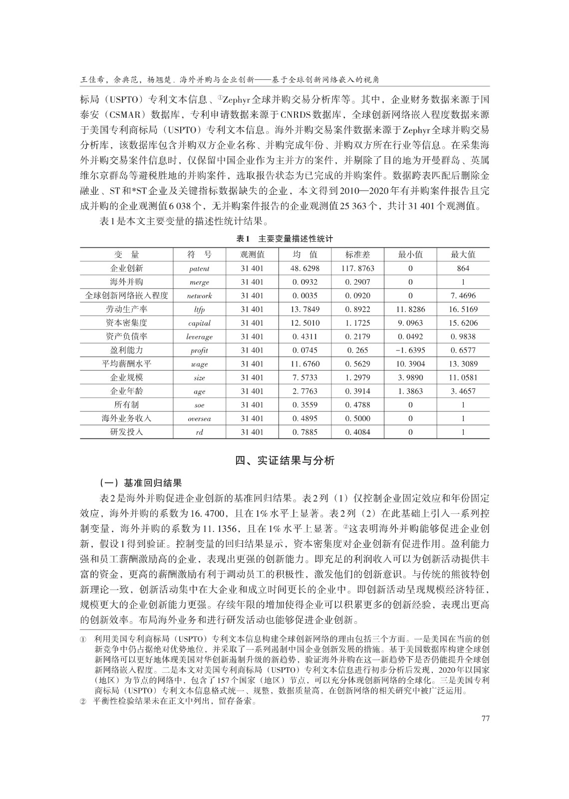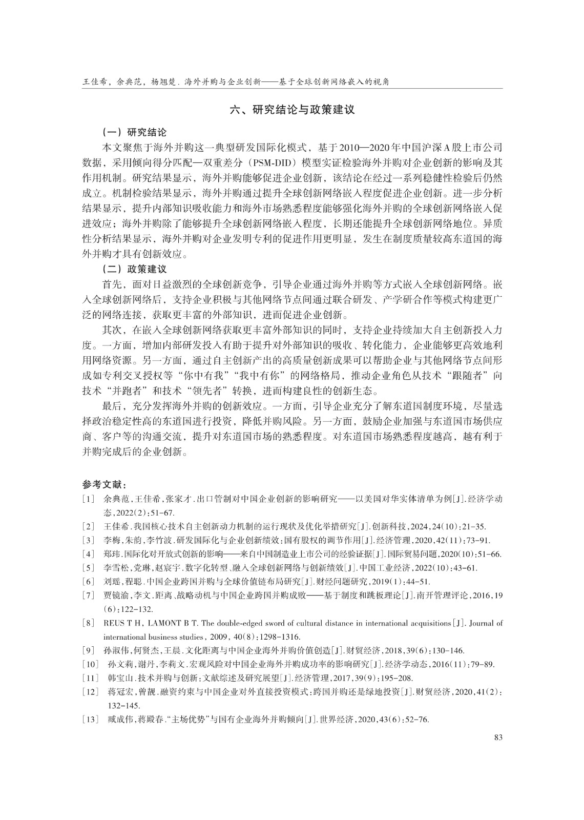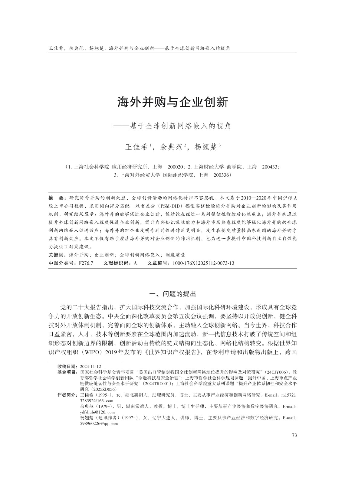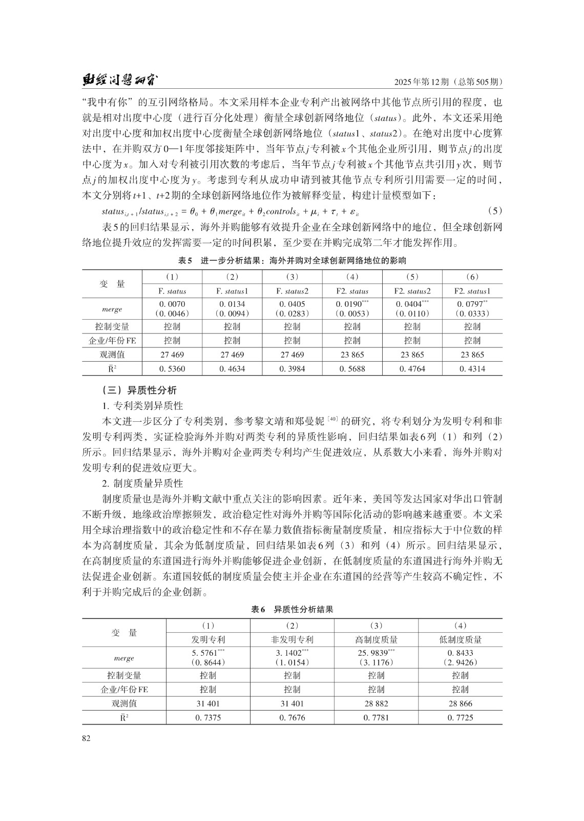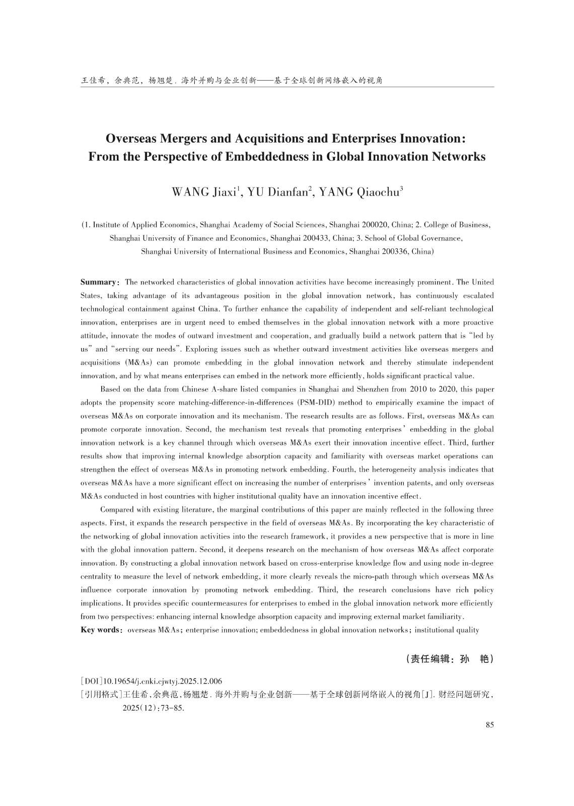 关键词: 海外并购;企业创新;全球创新网络嵌入;制度质量