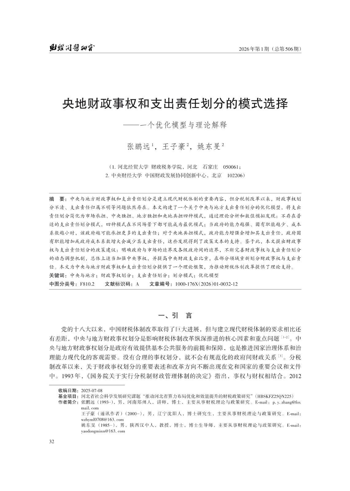 中央与地方;财政事权划分;支出责任划分;划分模式;优化模型