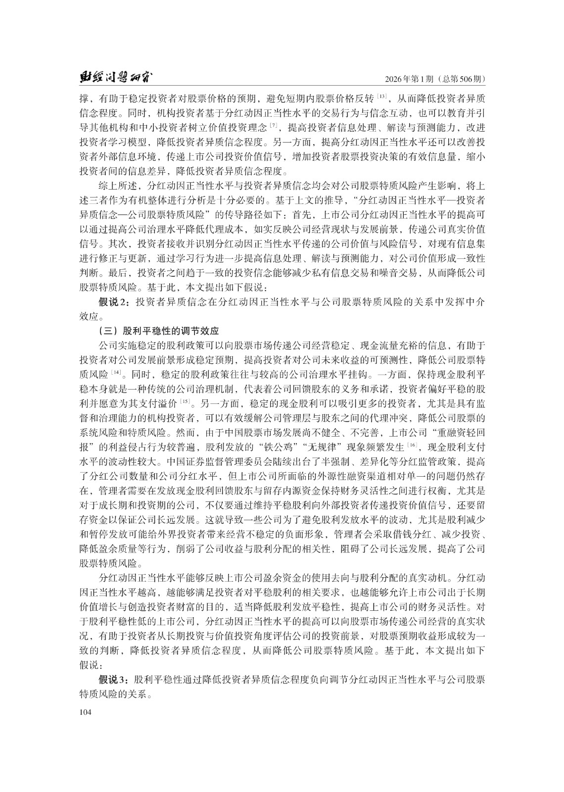分红动因正当性水平;公司股票特质风险;投资者异质信念;股利平稳性
