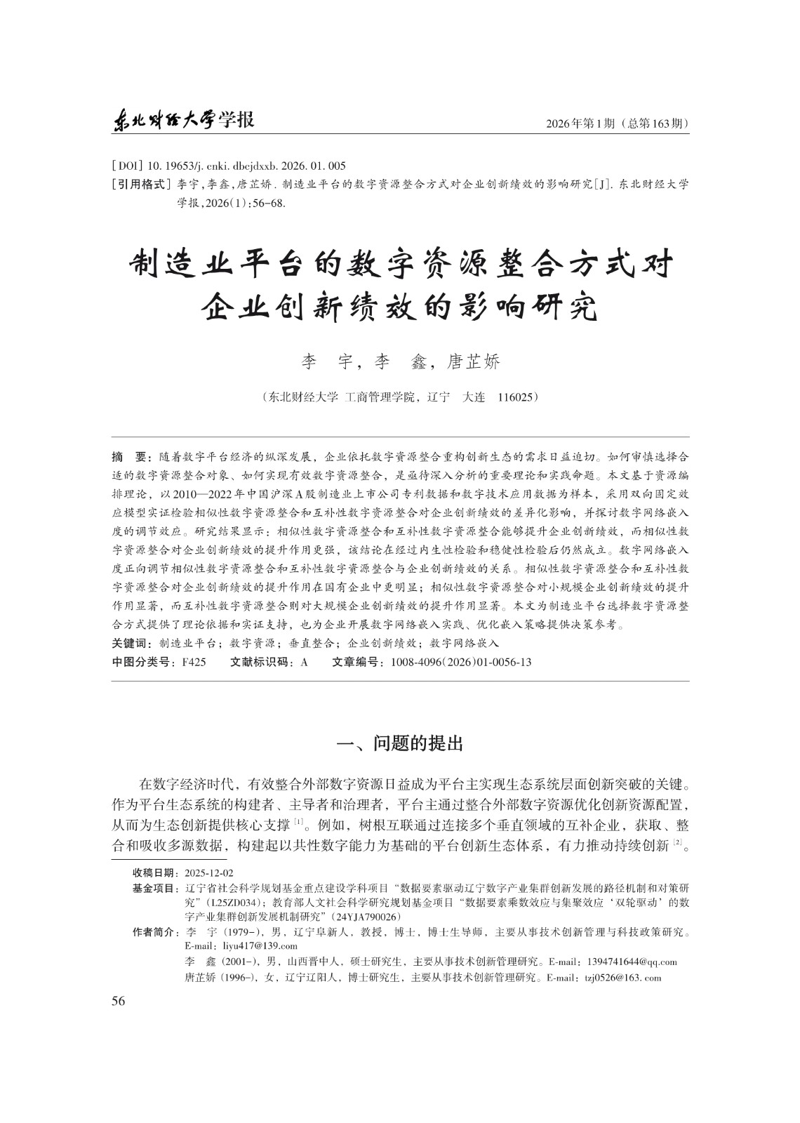 制造业平台;数字资源;垂直整合;企业创新绩效;数字网络嵌入
